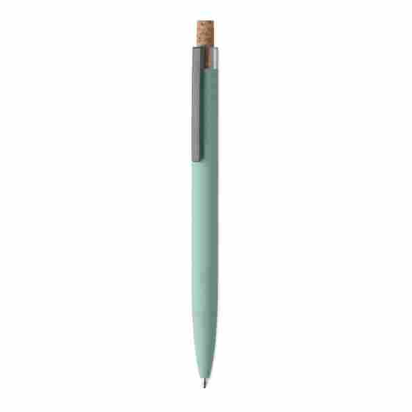 Push ball pen in recycled aluminium with cork detail button and metal clip.