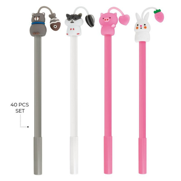 Set of liquid ink pens, with assorted designs. Supplied in a pack of 40 assorted pieces (10 per design). Blue ink.