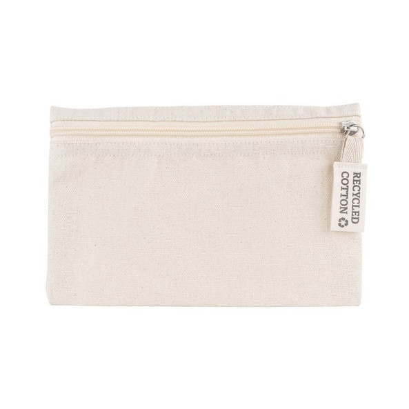 Pouch made of recycled cotton with coordinated zip closure, featuring a zipper pull with recycled cotton label.