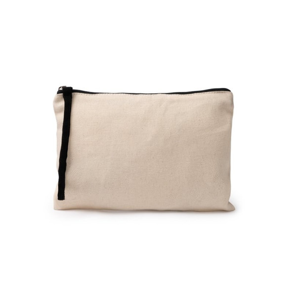 Pouch in 100% cotton 150 g/m2. Large main compartment with zip closure. Front pocket with zip closure.