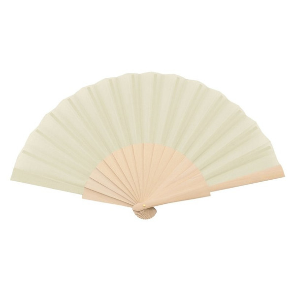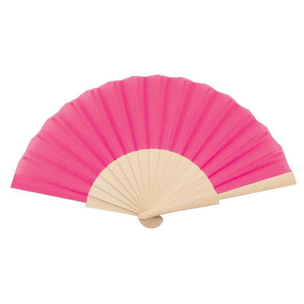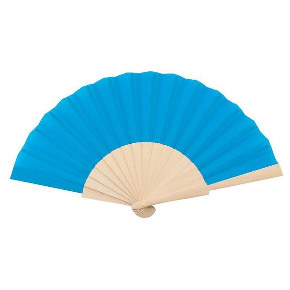 Fan with ribs in natural wood and polyester fabric. In assorted colors and presented in an individual box.
