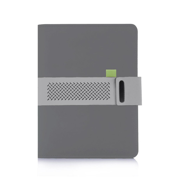 Documents holder with tablet and smart phone support. With striped notebook and calendar on every page. Pen holder and pockets for cards and documents. Magnetic closure.