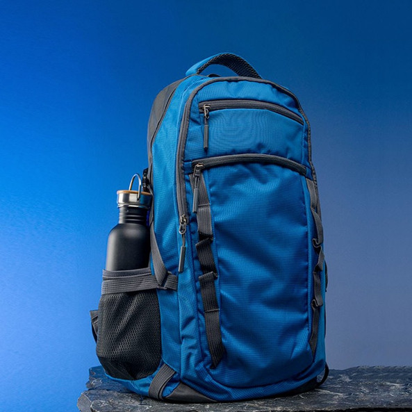RPET computer backpack, front pockets with zippers, side mesh pockets, internal compartment for 15" laptop, back and handle reinforcements, and large printing area.