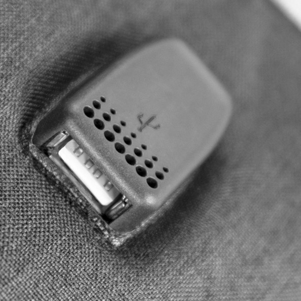 Polyester computer backpack with denim effect. Padded internal compartment for laptops up to 15.6''. It also features a USB output for connecting a power bank (not included).