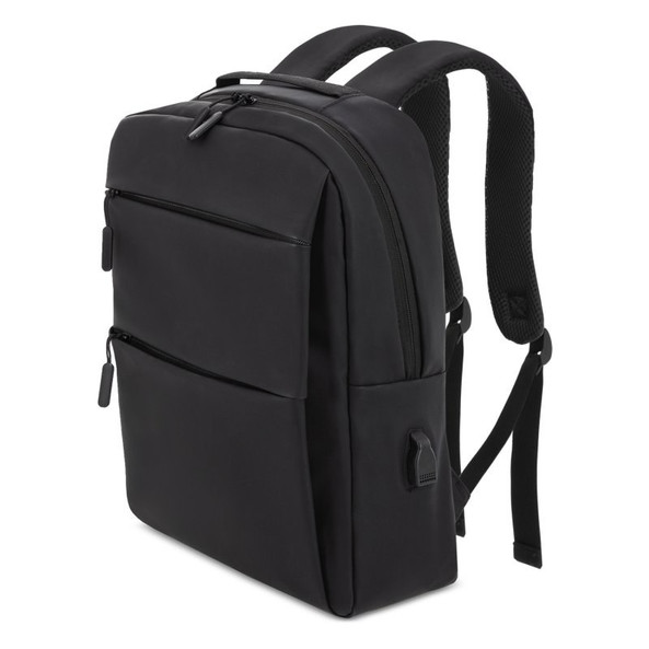 Laptop backpack with a large main compartment with zip, including a padded internal compartment for laptops up to 17". Two front zippered pockets. USB port. Adjustable padded shoulder straps. Trolley strap.