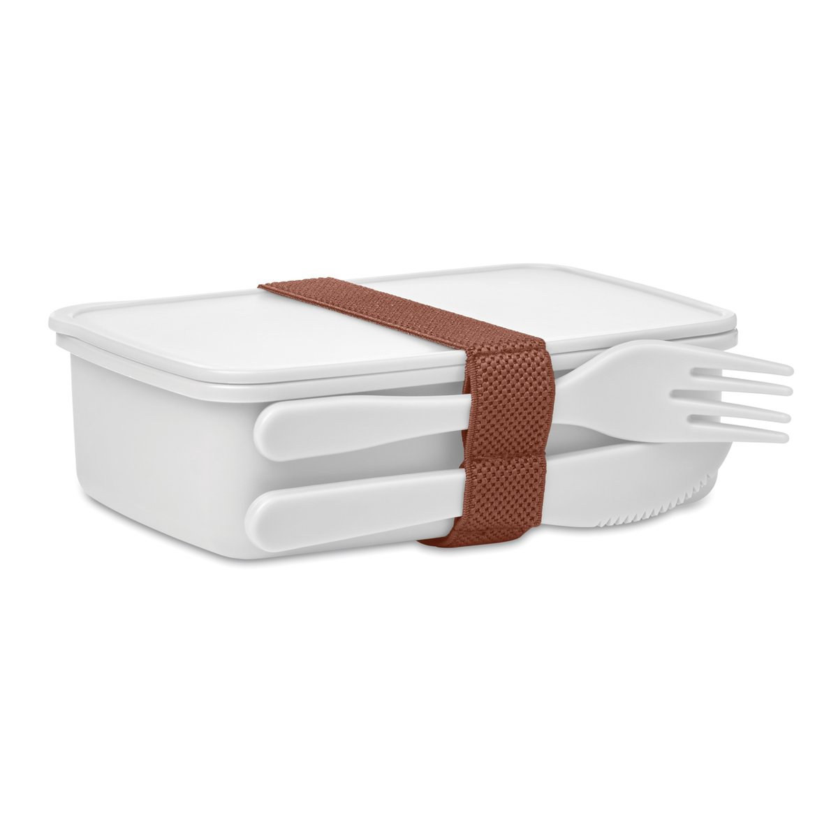Lunch box with one compartment in PP, cutlery included fixed with elastic band. Bringing your favorite homemade lunch with you, whether for work or a picnic, is a healthy way to eat. With a capacity of 700 ml, you can bring enough food for one day. The knife and fork are included and are made of the same PP material.