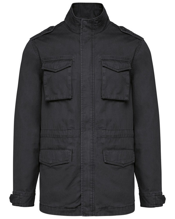 Zip fastening with metal slider and main fabric pull tab, as well as a button placket with invisible press studs at centre front.
