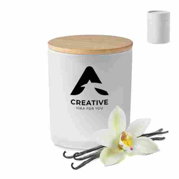 Fragranced plant based wax candle in frosted glass jar holder with bamboo lid.