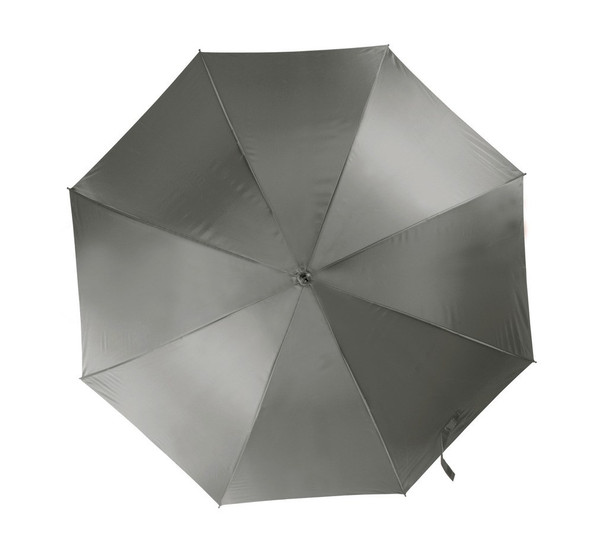 This automatic opening umbrella is made of 210T polyester fabric and has a length of 23" or 58,5 cm, a diameter of 105 cm, a metal shaft with a thickness of 10 mm, fiberglass ribs, a rounded handle made of polypropylene plastic covered with rubber to give it a contemporary look, and metal shaft tips.