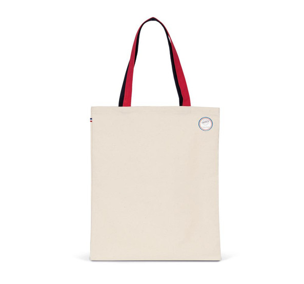 A woven label with a French flag is sewn onto the side of the bag. The 2.5-cm wide and 50-cm long woven handles are in contrasting colours.