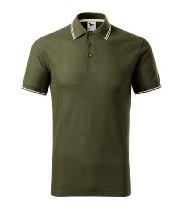 cut with side seams, 1:1 rib knit collar, 2 contrast stripes on sleeve hems and collar, placket with 3 buttons in the shell fabric colour, last button sewn in contrast colour thread, inner neckline with a contrast tape, fixing shoulder seams, slits in side seams with a contrast tape