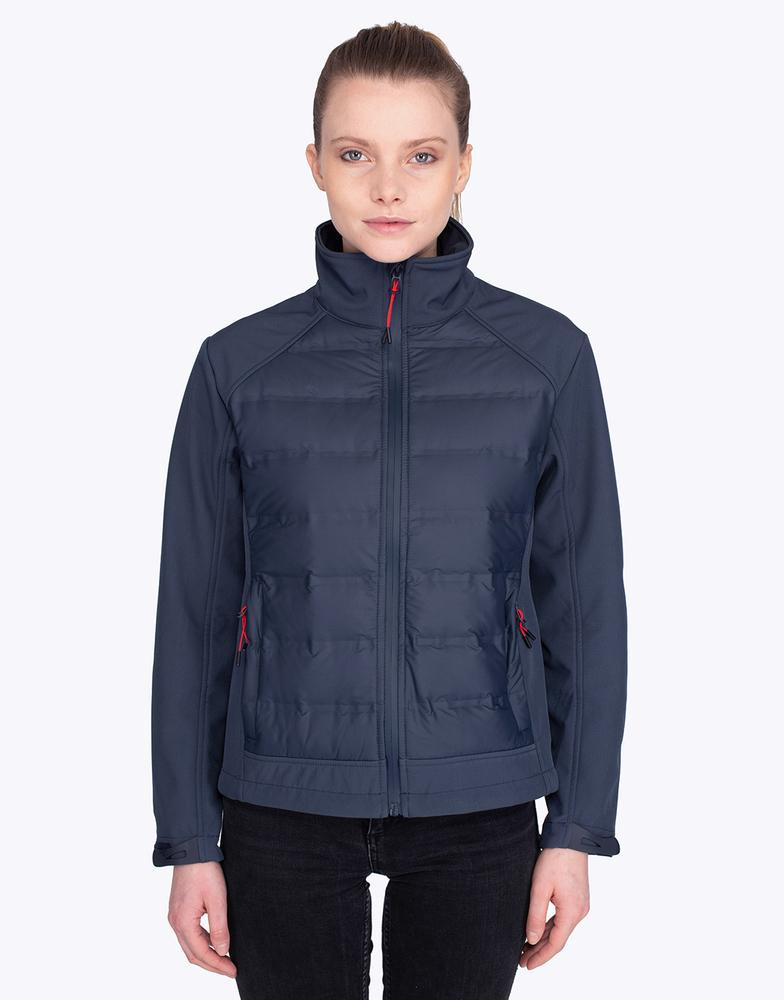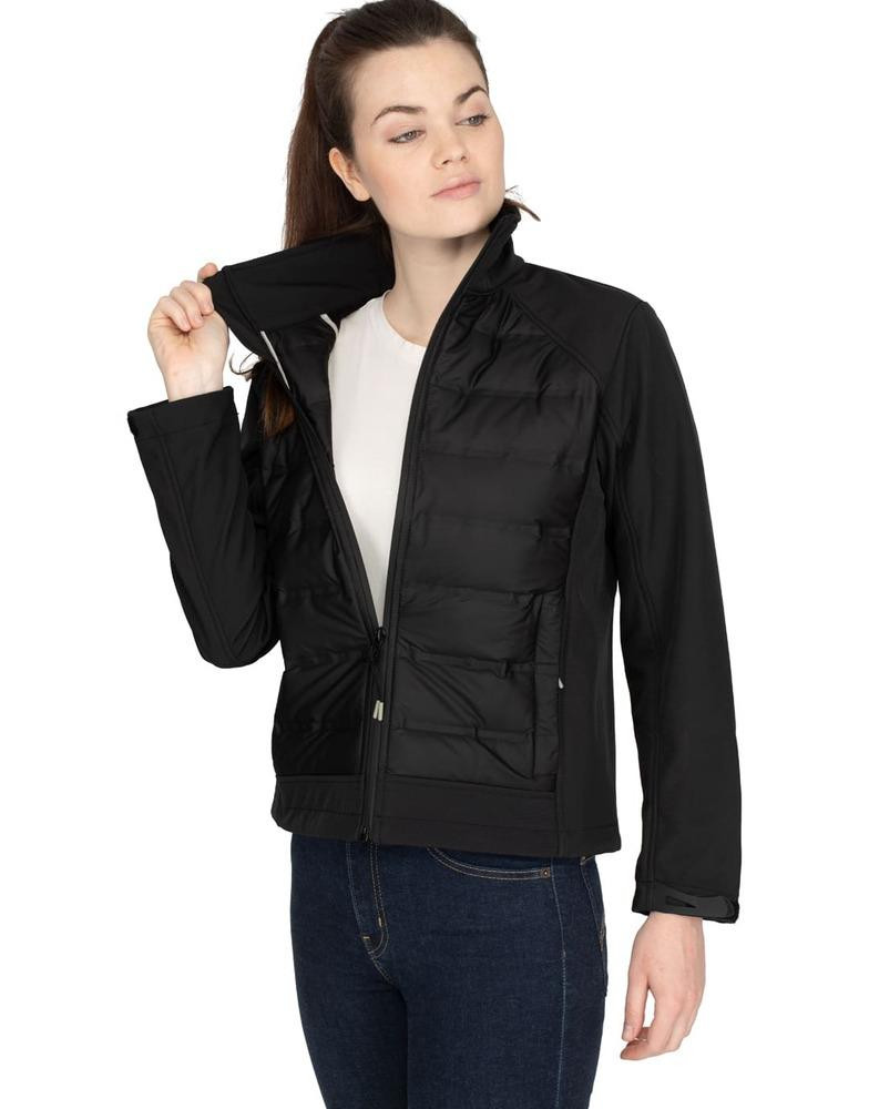 Hybrid jacket for its softshell-down jacket combination. The bust consists of a real down puffer jacket with a welded, waterproof and water-repellent construction. The sleeves, shoulders and back are made of a 3-layer softshell material with a membrane which makes the product waterproof and water-repellent. The down jacket gives comfort and warmth when the softshell gives hold and looks. 2 zipped hand pockets. 50D polyester coating. Adjusted fit for Women