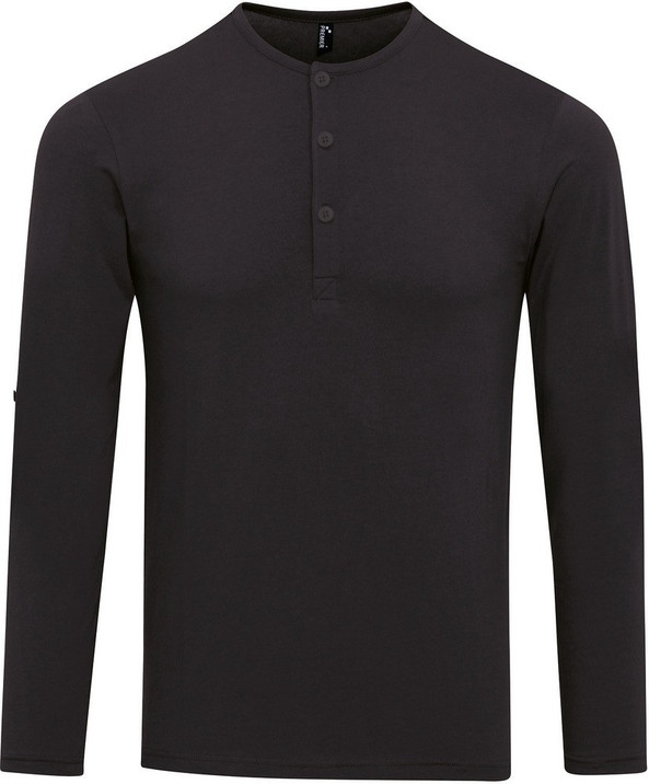 This t-shirt has a round neck with a 3-button opening , it can be worn long- sleeved or rolled up thanks to its button placket on the sleeves .