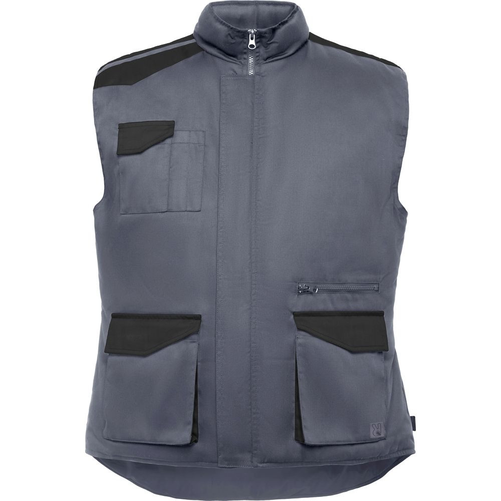 Multipocket work vest in two-colour combination, with high collar.- Front zip with velcro.- Windbreakers in cuffs.- Right side outer pocket for the mobile with flap and velcro.- Two pleated front pockets with flap and velcro.- Two pen pockets.- Inside pocket with velcro.- Zip pocket.- Drop tail.- Automatic adjuster.- Contrasting shoulder pieces and details.