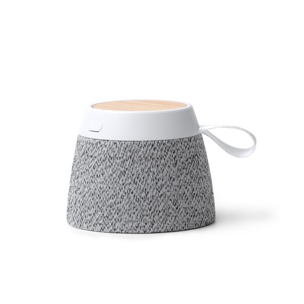 Wireless speaker with body made from bamboo and RPET fabric, with 5 W power output and a 300 mAh battery.