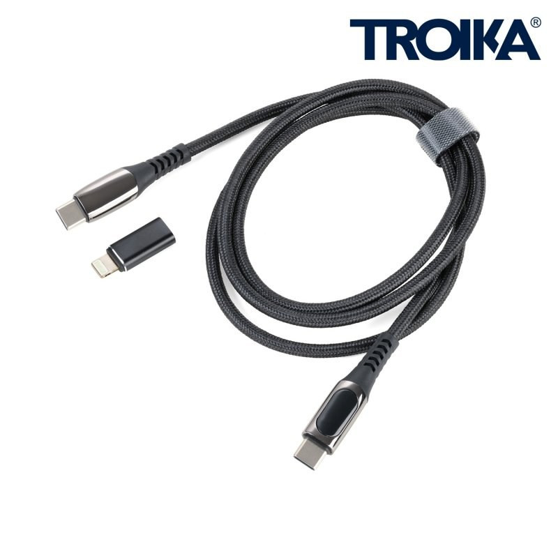 Charging cable High-Speed USB-C 100W PD Power Delivery to USB-C, with data transmission function, charging up to notebook size possible via USB-C, full charging capacity: max. 100W|20V|5A (without adapter) depending on the device to be charged, with digital display of the charging power, incl. USB-C to Lightning adapter, cable textile coated, 1m long, metal, polyester, black/gunmetal