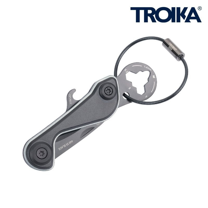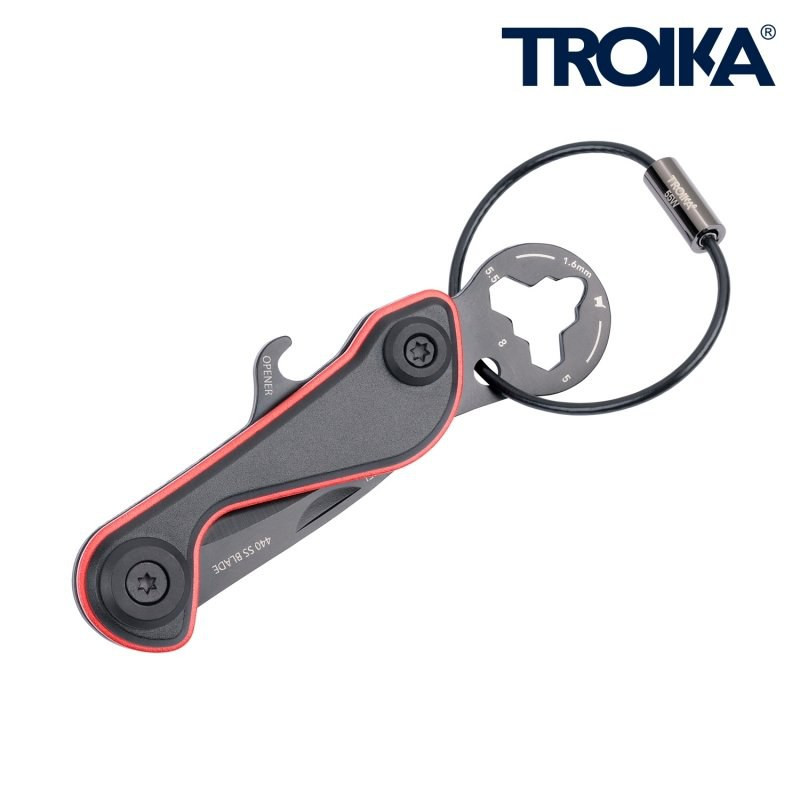 Mini tool with 9 functions, shopping trolley release, parcel cutter + blade made of 440 stainless steel with snap-in function, keyring (wire loop), bottle opener, hexagonal key (3 sizes), tyre depth gauge (1.6 mm), 440 stainless steel, aluminium, anodised, black/red